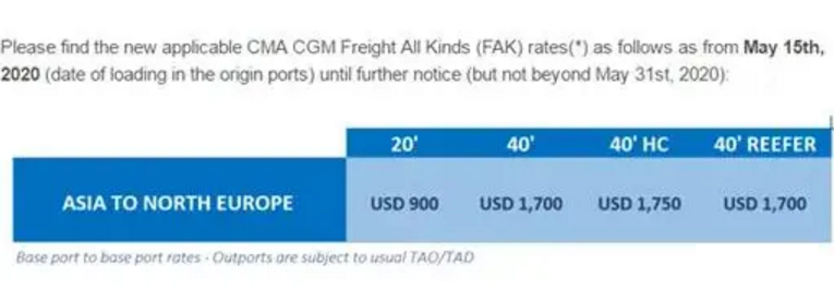 对比5月15日实施的价格表,每40英尺集装箱、40英尺高箱和40英尺冷藏箱的FAK,均上涨了300美元。