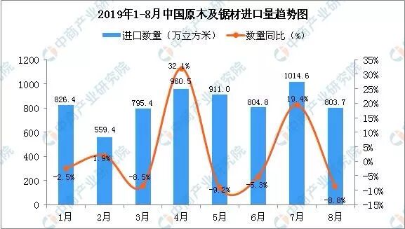 据中商产业研究院数据库显示,2019年1-2季度中国原木及锯材进口量有所增长,2019年8月中国原木及锯材进口量为803.7万立方米,同比下降8.8%。