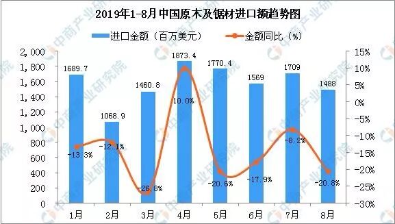 从金额方面来看,2019年8月中国原木及锯材进口金额为1488百万美元,同比下降20.8%。