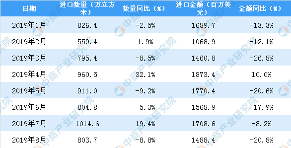 2019年8月中国原木及锯材进口量同比下降8.8%