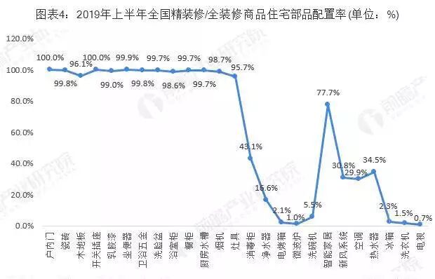 2019年上半年,精装房中建材、卫浴与厨房部品配置率很高,已经上升到96%了,比如户内门、瓷砖、木地板、开关插座、坐便器、卫浴五金、洗面盆、浴室柜、橱柜、厨房水槽等。