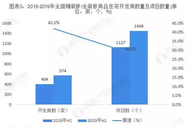 据奥维云网的数据,2019年上半年,全国共有574家开发商、开盘1448个精装修/全装修商品住宅项目,开发商及项目增速分别是42%、28%。