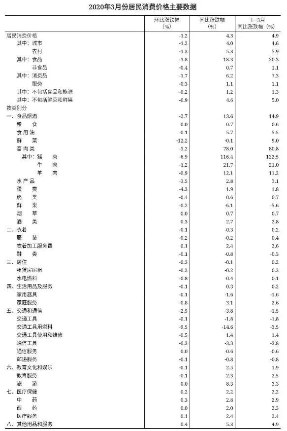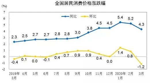 2020年3月,全国居民消费价格同比上涨4.3%。其中,城市上涨4.0%,农村上涨5.3%;食品价格上涨18.3%,非食品价格上涨0.7%;消费品价格上涨6.2%,服务价格上涨1.1%。一季度,全国居民消费价格比去年同期上涨4.9%。