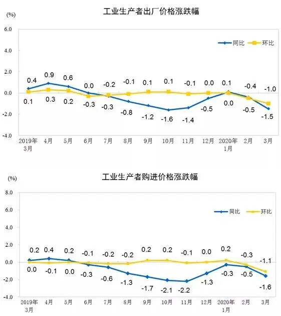 2020年3月,全国工业生产者出厂价格同比下降1.5%,环比下降1.0%;工业生产者购进价格同比下降1.6%,环比下降1.1%。一季度,工业生产者出厂价格比去年同期下降0.6%,工业生产者购进价格下降0.8%。
