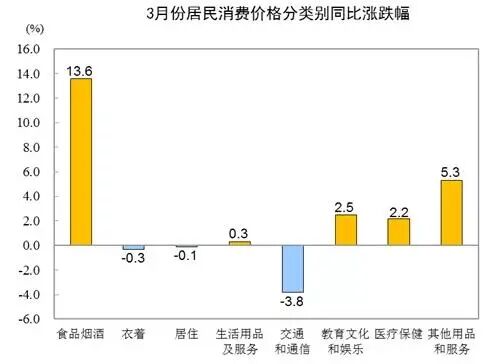 3月份,食品烟酒类价格同比上涨13.6%,影响CPI(居民消费价格指数)上涨约4.10个百分点。