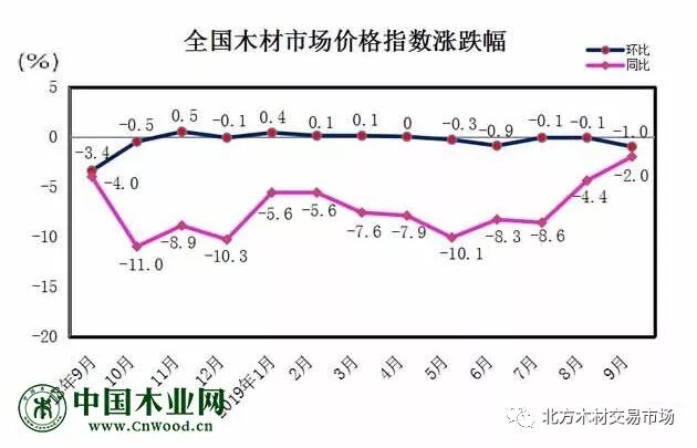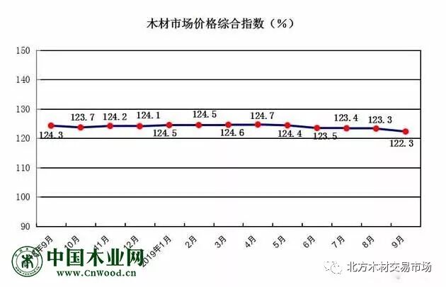 2019年9月,中国木材市场价格综合指数为122.3,环比下滑1.0个百分点,同比下滑2.0个百分点。其中,原木价格环比下滑0.8个百分点,同比下滑4.2个百分点;锯材价格环比下滑0.3个百分点,同比下滑6.6个百分点。国产木材价格环比下滑0.1个百分点,同比下滑2.6个百分点;进口木材价格环比下滑1.5个百分点,同比下滑5.2个百分点。