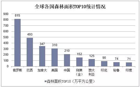 目前,全球森林总面积约为30多亿公顷,占全球总面积的27%。其中俄罗斯以815万平方公里位居第一,排第二的是巴西,森林面积为493万平方公里,其次是加拿大,森林面积为347万平方公里,中国排第五,面积为210万平方公里。