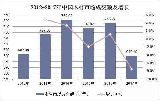 从市场成交额来看,2017年中国木材成交额下降明显,木材市场成交额为690.49亿元,同比降低7.5%。