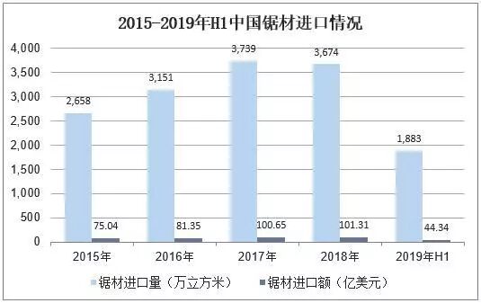 进口方面,截至到2019年上半年,中国锯材进口量为1883万立方米,同比增长3.7%,进口额为44.34亿美元,同比降低14.2%。